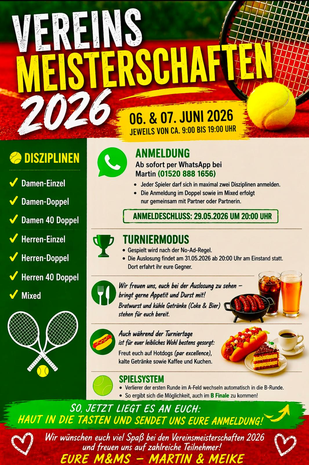 unsere diesjährigen Vereinsmeisterschaften finden am 06. und 07. Juni 2026, jeweils von ca. 9:00 bis 19:00 Uhr, statt.